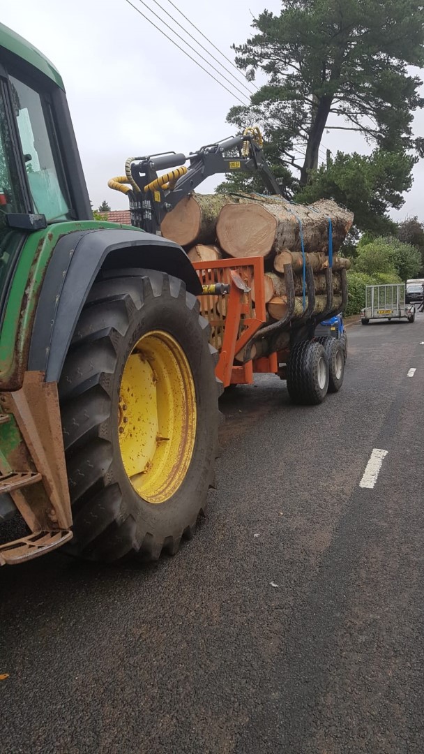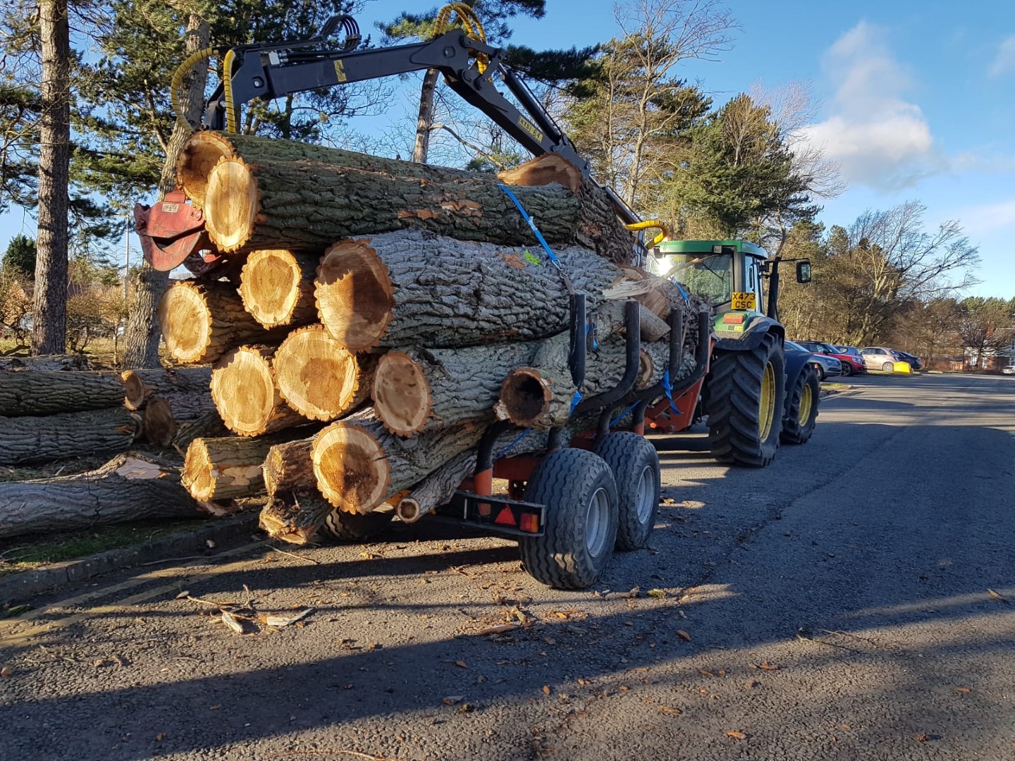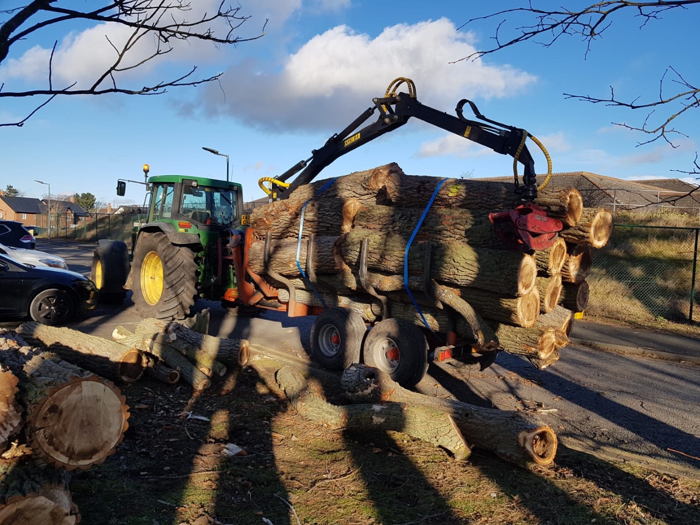 The gallery below illustrates some of our operated machinery hire contracts.  The photographs show a John Deere tractor and crane used to move timber for a customer.  The tractor and trailer was used to move timber for another tree surgeon at Darras Hall.  Our multi One Loader was also used to muck out a small old listed byre .